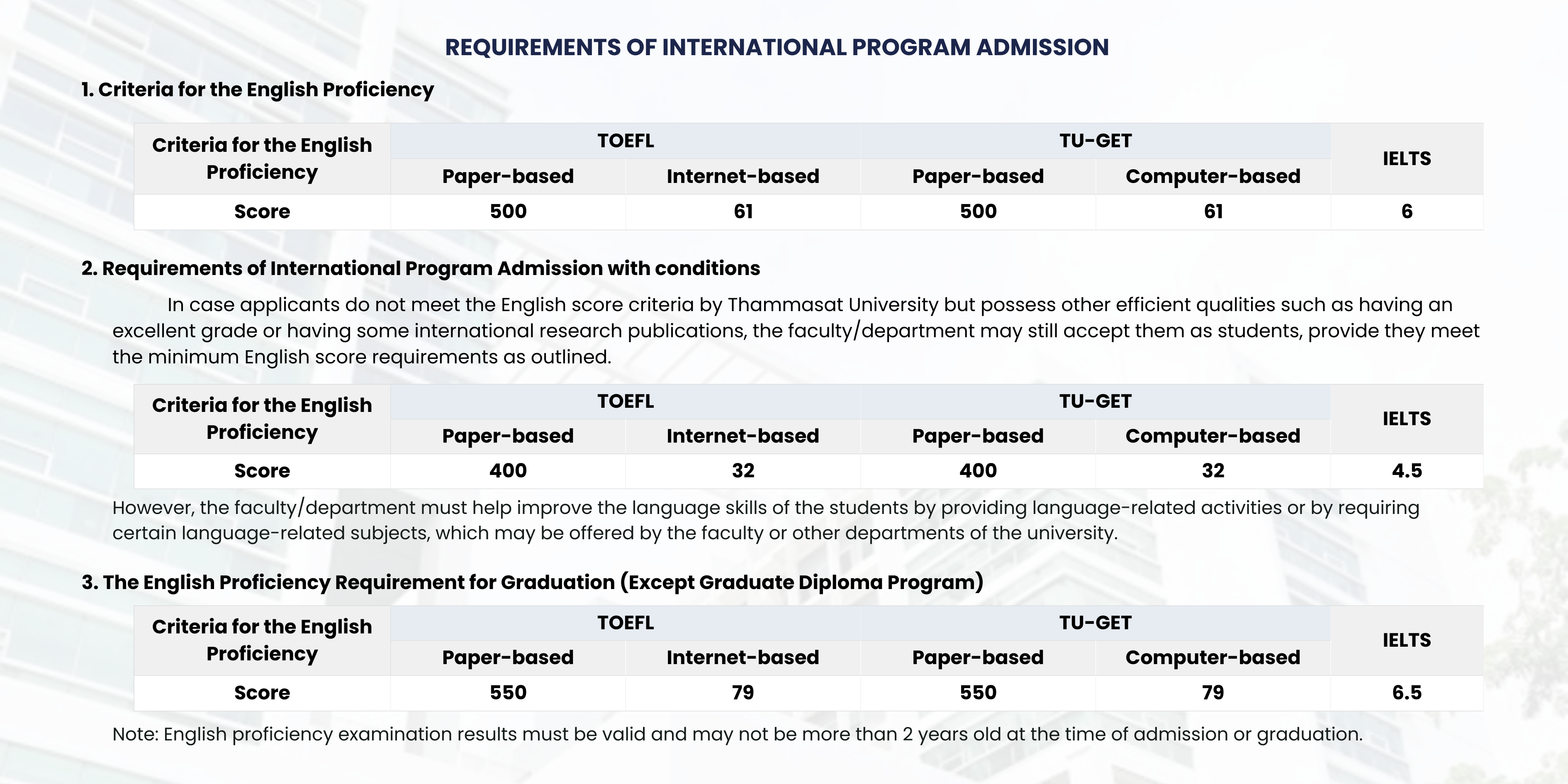2.1.4 Other qualifications as required, according to section 8 of Thammasat University Regulations Relating to Graduate Degrees.